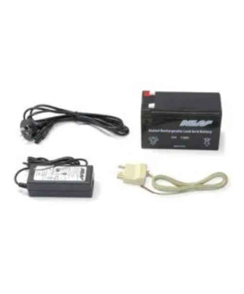It includes a 17V 3A DC power pack, a 12V 7Ah backup battery for power outages, and a telephone dialer lead for communication support.