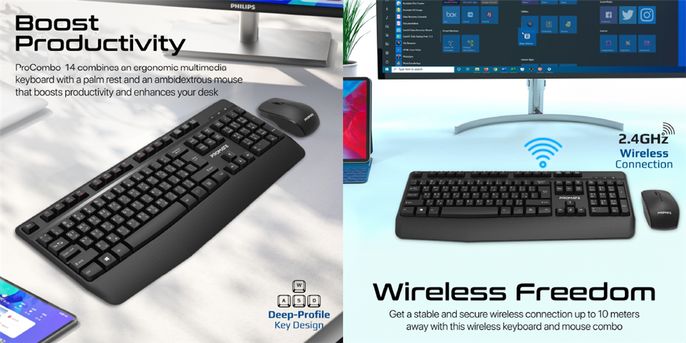 - Complete Wireless Freedom with 2.4GHz Connectivity: The Promate ProCombo-14 wireless keyboard and mouse use 2.4GHz wireless transmission technology to provide a fast and reliable wireless connection range of up to 10 meters to help you work with confidence without any lag or delays.