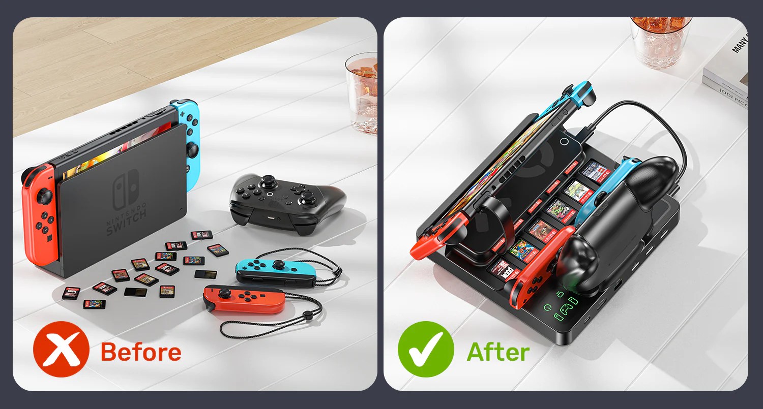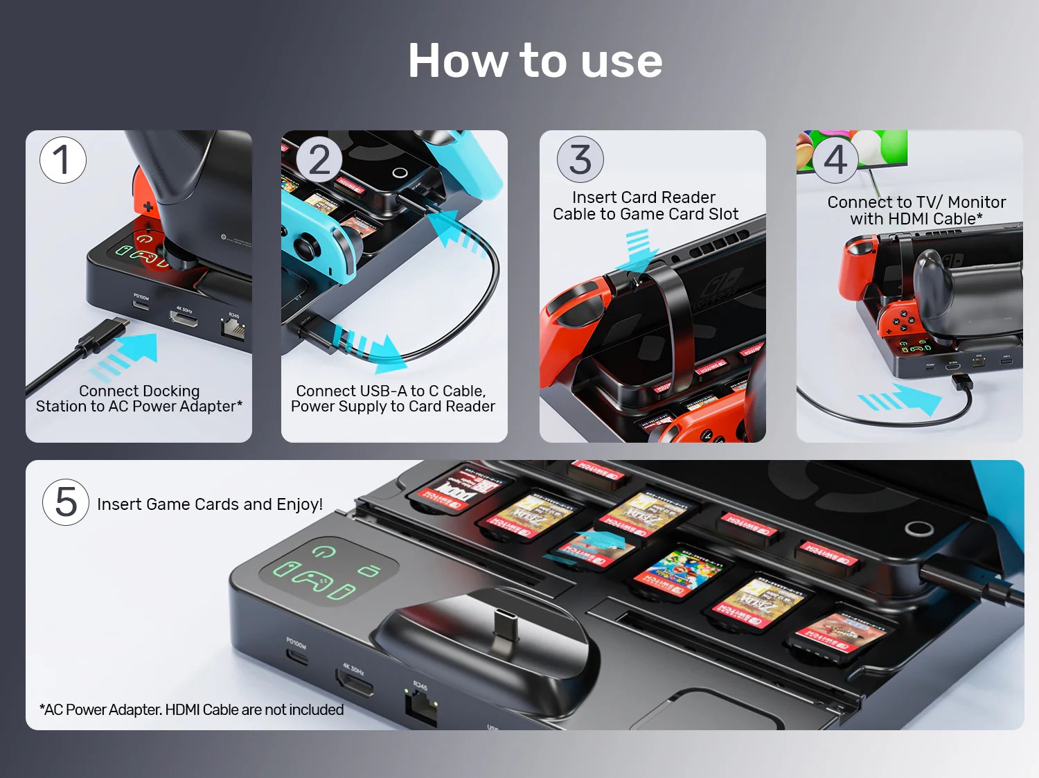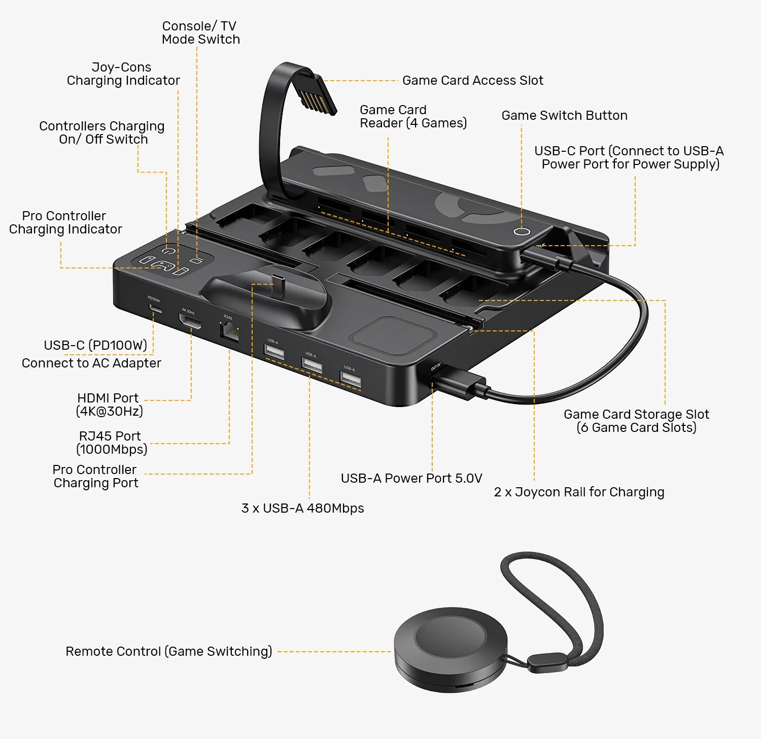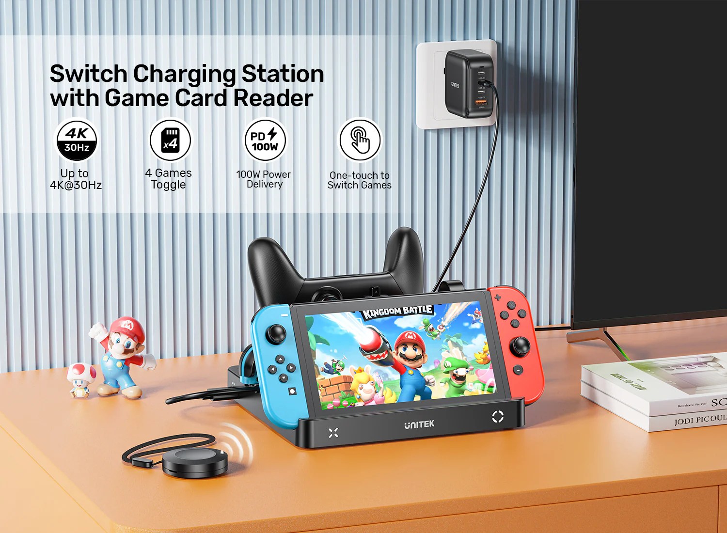 Adequate Game Card Storage:Â This UNITEK Gaming Switch Docking Station features built-in slots for storing up to 10 game cards: 4 slots for active game cards and 6 slots for storing additional game cards.