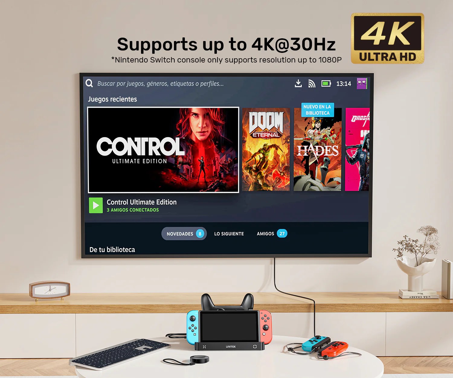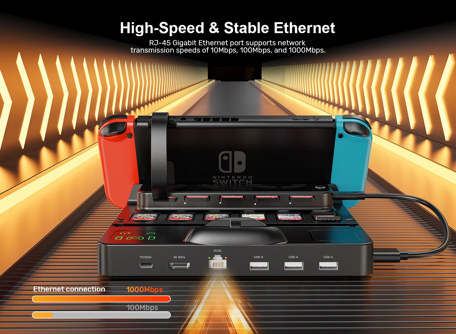 High-Speed & Stable Ethernet: This UNITEK Gaming Switch Docking Station features an RJ-45 Gigabit Ethernet port that adapts to 1000Mbps network transmission, ensuring users experience stable and high-speed gameplay.