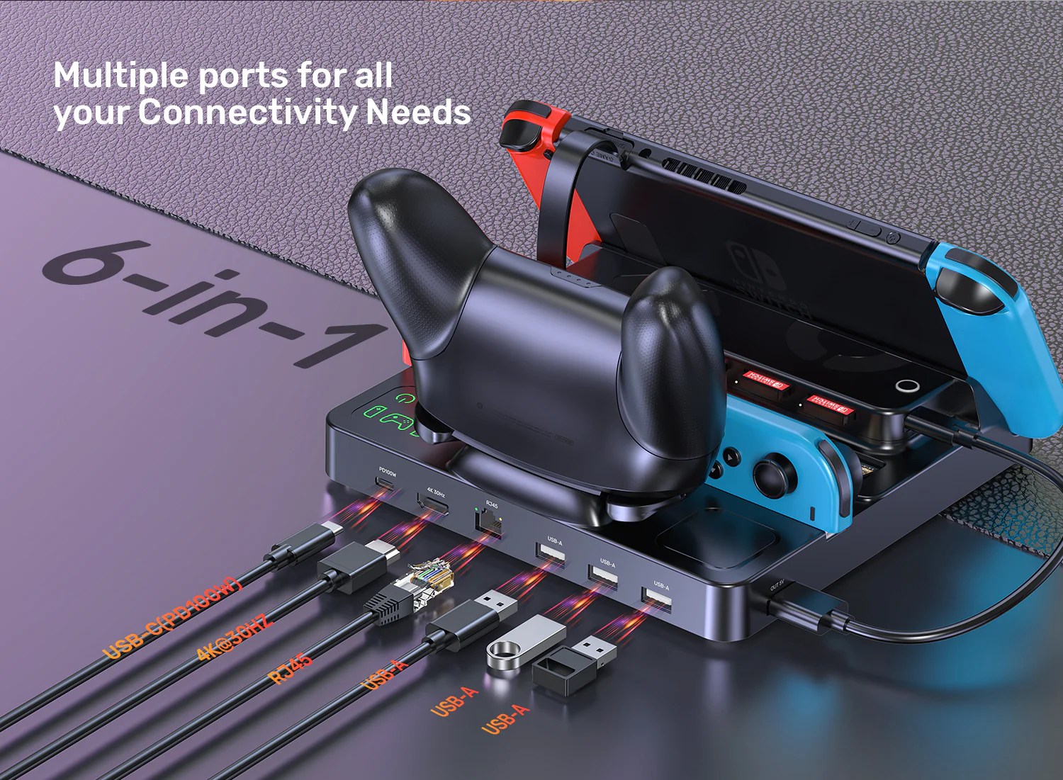 Charge While Playing:Â The UNITEK Gaming Switch Docking Station enables simultaneous charging of both Joy-Cons and Switch Pro Controller while in TV or tabletop mode, allowing longer play sessions.