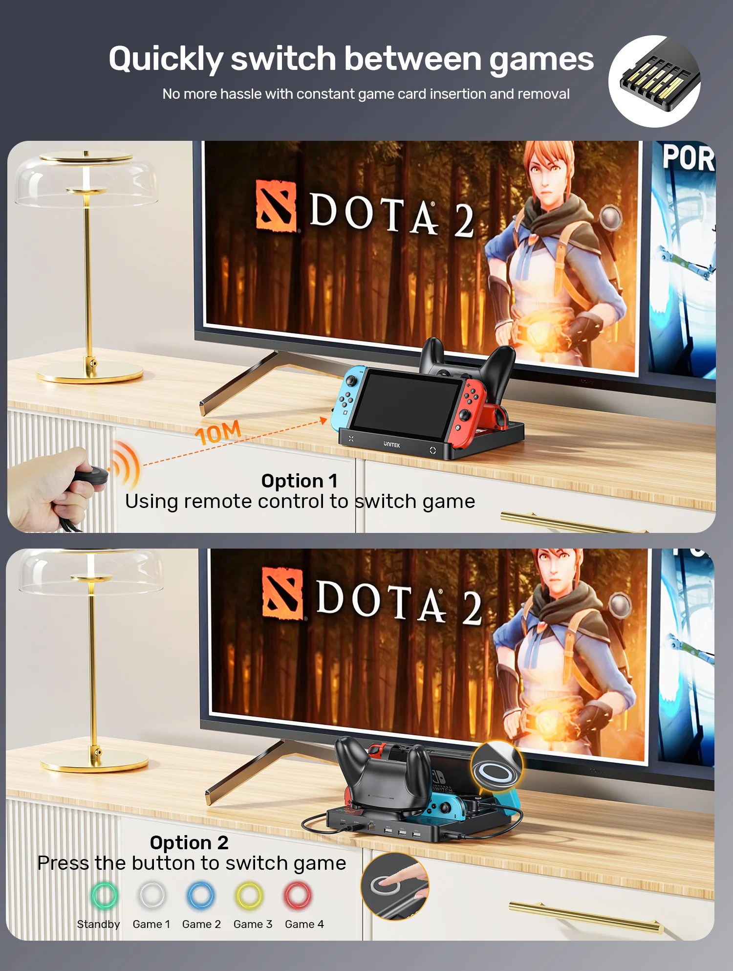 One touch Game Switching: The UNITEK Gaming Switch Docking Station supports inserting 4 game cards into the Game 1-4 card reading slots. Users can easily switch games using the wireless remote control (maximum distance 10m) or by pressing the LED switch button on the device.